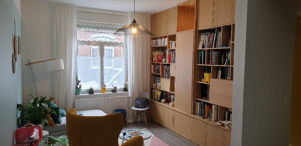 Ce chantier à Mons-en-Barœul illustre parfaitement la capacité de l’entreprise à concrétiser les idées d’un architecte tout en y ajoutant une touche artisanale unique. Le résultat : une bibliothèque sur mesure, design et intemporelle, qui sublime l’intérieur du client.